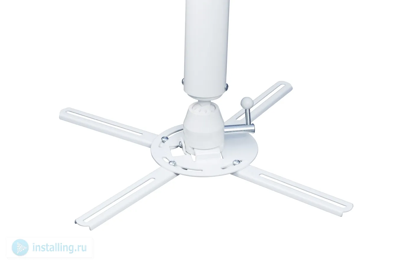 C регулировкой расстояния от потолка. Быстросъемный механизм для обслуживания проектора. Скрытый кабель-канал. Крепление типа паук с 4 лапками. до 30 кг, от потолка 520–600 мм, белое