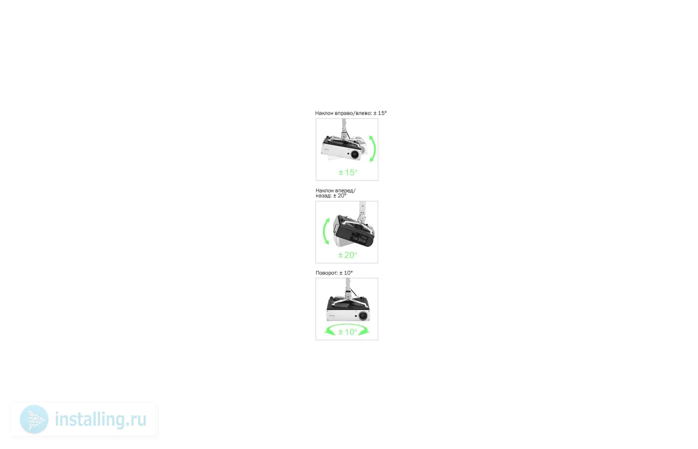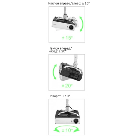 С двумя телескопическими штангами. Плавная регулировка длины крепления в диапазонах: от 55 до 87 см и от 95 до 160 см. Регулировка наклона/поворота проектора в пределах +/- 15 /10°. Цвет - белый. Кабельный канал. До 20 кг