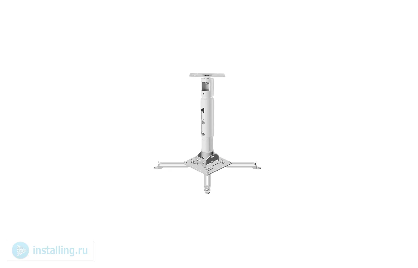 Состоящий из крепления+штанги 15-28 см +площадки к потолку для проектора, максимальное расстояние между крепежными отверстиями 453 мм, наклон +/- 15°, поворот +/- 8°, вращение 360°, до 35 кг, белый