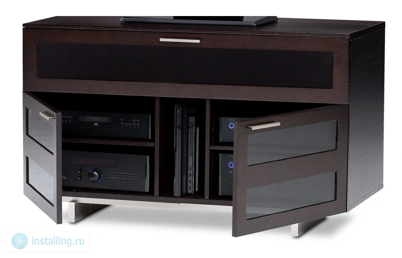 Имеет два отделения с полками и верхний выдвижной ящик (для акустики и DVD-дисков). Отделка: Espresso, Габариты (ШхВхГ): 107 x 78 x 56 см (арт. BDI8928Es)