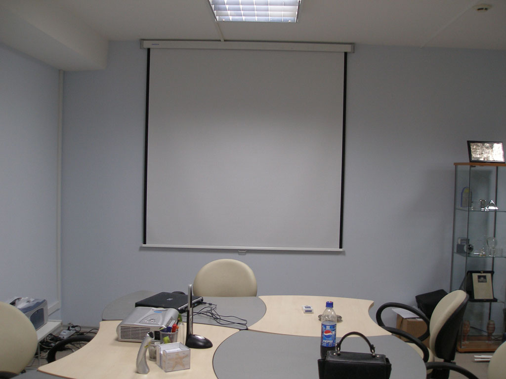 Установить стационарный проектор со сменным объективом на стене, для отображения видео презентаций на большом экране без затемнения помещения.