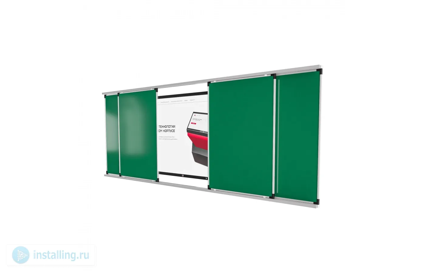 - Система установлена на специальных направляющих (рельсах), позволяющих легко двигать классическую доску вдоль стены, открывая или закрывая интерактивный дисплей. Это особенно ценно в классах с ограниченным пространством или при необходимости быстро менять формат работы (от работы с доской к просмотру презентации и обратно).