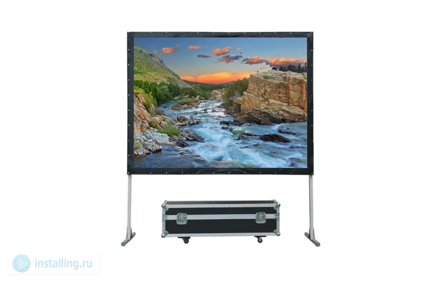 Компактный экран для мобильного использования. Основная сфера применения - шоу-бизнес, выставки, обучающие семинары. Легко раскладывается и убирается в металлический кейс на 4 колесиках. Состоит из цельной крепкой стальной рамы и двух Т-образных армированных ножек и не теряет своей прочности при частых транспортировках.