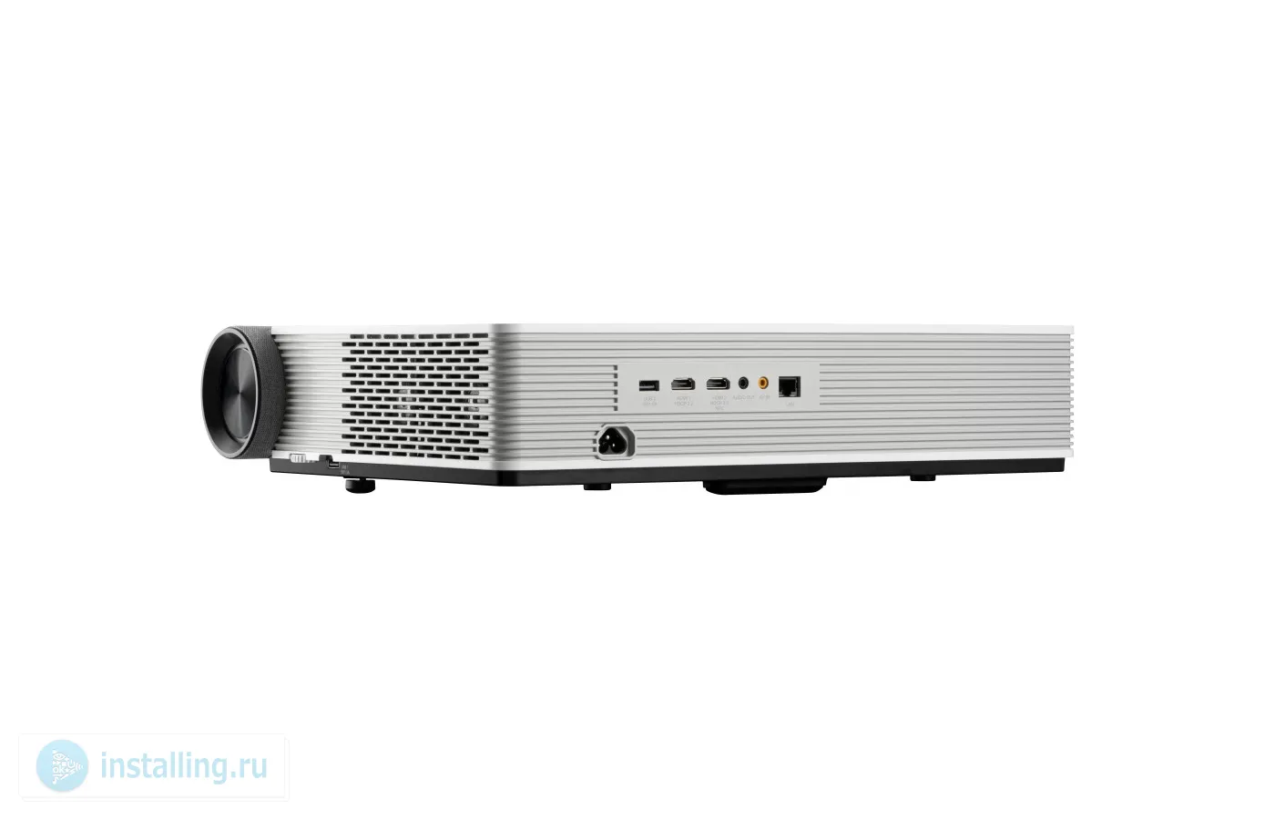 Выделяется среди аналогов премиальной акустикой Harman Kardon 50 Вт, Экстра качественное звучание обеспечивается тем, что акустика не встроена в корпус, а представляет собой отдельный саундбар, присоединенный к проектору с фронтальной стороны.