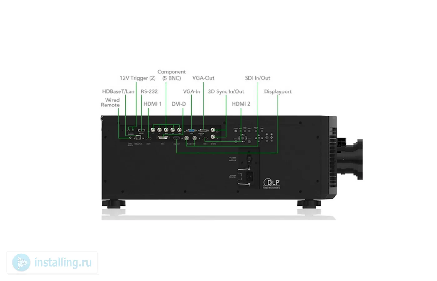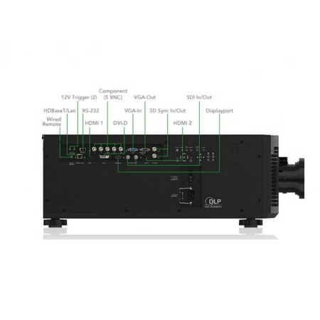 В проекторе реализована возможность подключения по 3G-SDI и HDBaseT, что позволит транслировать сигнал без малейшей потери качества даже в том случае, если источник контента находится в относительном отдалении от самого проектора. Дополнительную гибкость в установке устройства и настройке качества изображения обеспечивают пять опциональных линз .