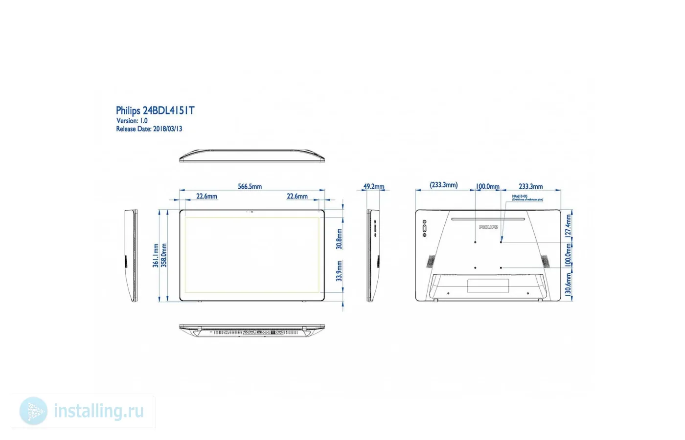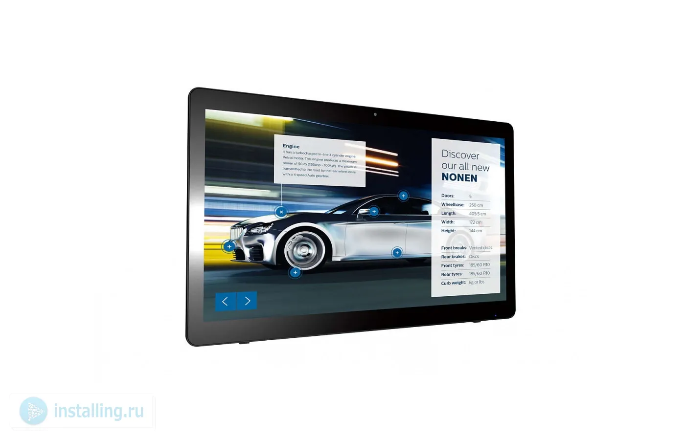 23,6" (59,94 см), 1920х1080, 1000:1, 250 кд/м2, 10 касаний, встроенная камера 2 МП/1080P, Android 7.1. Стандарт VESA: 100 х 100 мм. Габариты (ШxВxГ) 566,50 x 361,1 x 49,20 мм. Вес 4.7 кг.