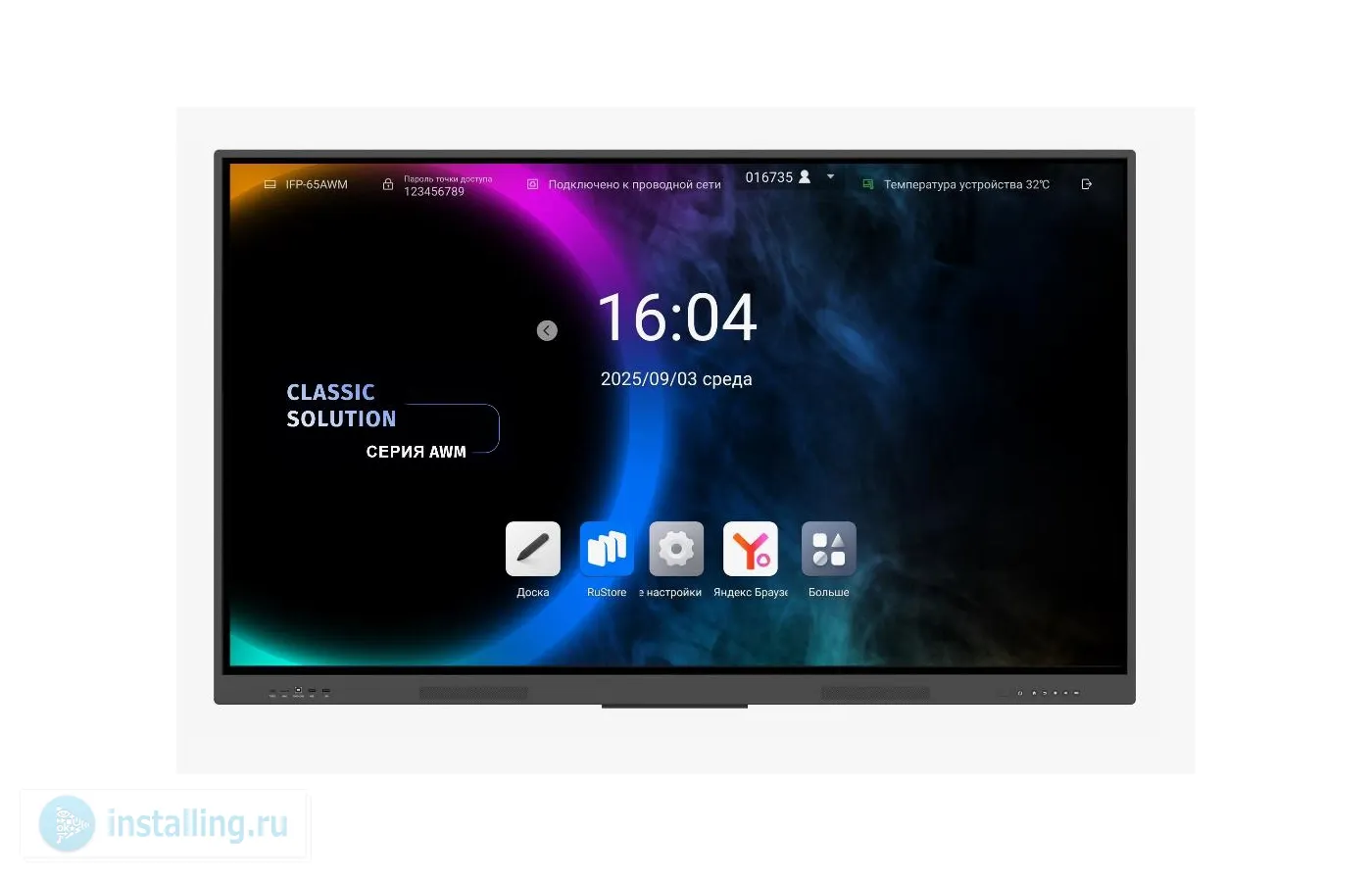 4K, 65", 500 нит, 5000:1, 40 касаний, 8 ядерный ARM Cortex A55(1,5 GHz ), 8GB/128GB(MAX384GB), HDMI2.0x3, USB-A2.0x2, USB-A3.0х2, USB-B2.0x2, USBType-Cx1, MICx1, RS-232x1, SPDIFx1, HDMI 2.0, OUTx1, Audio outx1, LANx1, TFх1, WIFI, BT, 20W x 2, Android 14