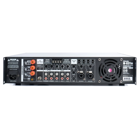 CVGaudio M-83Tm – профессиональный микшер – усилитель со встроенным модулем источника сигнала предназначенный для организации качественной трансляции фоновой музыки и речевого оповещения в торговых и общественных помещениях. Данная модель обеспечит отличное качество звучания и богатый функционал. Встроенный модуль источника состоит из MP3 плеера с возможностью проигрывания музыкальных треков с SDcard и USB флешь накопителей объемом до 32Gb, FM тюнера с памятью на 20 станций и возможностью подключения внешней антенны, а также Bluetooth модуля для проигрывания треков с мобильных устройств. Усилитель имеет мощность 80W и может работать как в трансформаторном 100V (основной режим работы), так и низкоомном 4-16ohm. Усилитель одноканальный, подключаемые к нему стереофонические линейные сигналы от источников звука корректно суммируются и на акустические системы подается уже усиленный монофонический сигнал, более корректный для систем фонового звука и Public Address (обеспечивающий более равномерное звуковое поле). Помимо встроенного звукового модуля CVGaudio M-83Tm имеет три линейных входа выполненные на разъемах 2RCA с возможностью выбора активного с помощью селектора на лицевой панели. Каждый вход имеет индивидуальную настройку чувствительности c обратной стороны усилителя. Первый канал селектора соответствует встроенному модулю источника сигнала. По умолчанию при включении модуль переводится в режим проигрывания MP3 фалов с USB / SDcard. Последовательным нажатием кнопки MODE можно выбрать другие режимы работы модуля – FM / Bluetooth / Line in (AUX 1). Также усилитель имеет два универсальных балансных входа выполненных на комбо-разъемах TRS Jack 6.3mm / XLR. Настраиваемый уровень чувствительности данных входов позволяет использовать их как для подключения микрофонов, так и источников сигнала линейного уровня. Линейные и балансные входа имеют раздельные двухполосные эквалайзеры, что позволяет осуществлять тонкую настройку звучания как для микрофонов, так и для устройств воспроизведения музыкального контента. Каждый балансный вход имеет возможность активации приоритета над линейными входами и встроенным плеером, а также подключения фантомного питание 24V для работы с конденсаторными / электретными микрофонами. Если включен селектор активации приоритета, то при появлении входящего звукового сигнала на контактах данного входа все остальные линейные входа мьютируются. Также мьютирование можно осуществлять с помощью управляющих контактов – MUSIC MUTE и FULL MUTE. При замыкании пары контактов MUSIC MUTE все линейные входа и встроенный звуковой модель мьютируются, а при замыкании контактов FULL MUTE мьютируюся все полностью (контакты “нормально разомкнутые”). Данная возможность позволяет интегрировать усилитель CVGaudio M-83Tm в систему пожарного оповещения и другие системы автоматики, где требуется управление через “сухие контакты”. Данная модель имеет актуальный пожарный сертификат и может использоваться в системах аварийно-пожарного оповещения. Усилитель выполнен в металлическом корпусе, лицевая панель из алюминия. Для установки в монтажный шкаф в комплекте имеются кронштейны, высота прибора в монтажной стойке - 2U. Основная масса элементов управления усилителя вынесена на заднюю панель, что ограничивает не санкционированный доступ к ним со стороны обслуживающего персонала. Встроенным