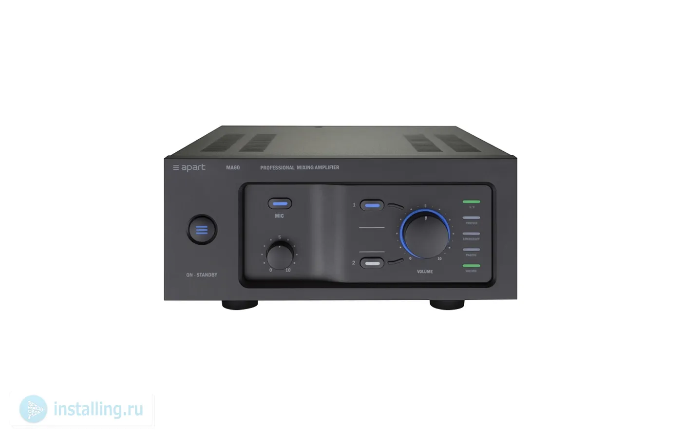 При разработке новой концепции микшера-усилителя один из главных выводов состоял в том, что необходимо оставить в нем только самое необходимое и сделать его удобным в использовании. Ультрасовременный микшер-усилитель Apart MA60 отличается интуитивно понятным набором органов управления на передней панели и необычной, но аккуратной и логичной компоновкой задней панели. Поворотный регулятор общей громкости визуально подчеркнут за счет увеличенного диаметра и подсветки, а регуляторы громкости микрофонов меньше по размерам и расположены в углублении панели. Микшер, заключенный в компактный корпус шириной 9,5 дюйма, оснащен одним универсальным микрофонно-линейным входом и двумя стереофоническими линейными входами с возможностью монофонического суммирования. Благодаря интеллектуальной системе маршрутизации звука с 4 уровнями приоритета и логично скомпонованной задней панелью пользователю не составит никакого труда разобраться с подключением. Среди прочего на задней панели MA60 располагаются входы для сигнала экстренного оповещения и пейджингового микрофона с тональным сигналом Chime. А также выход 24 В постоянного тока, для отключения регуляторов громкости серии E-VOL. Этот прогрессивный микшер-усилитель удивительно прост и понятен в монтаже и эксплуатации.