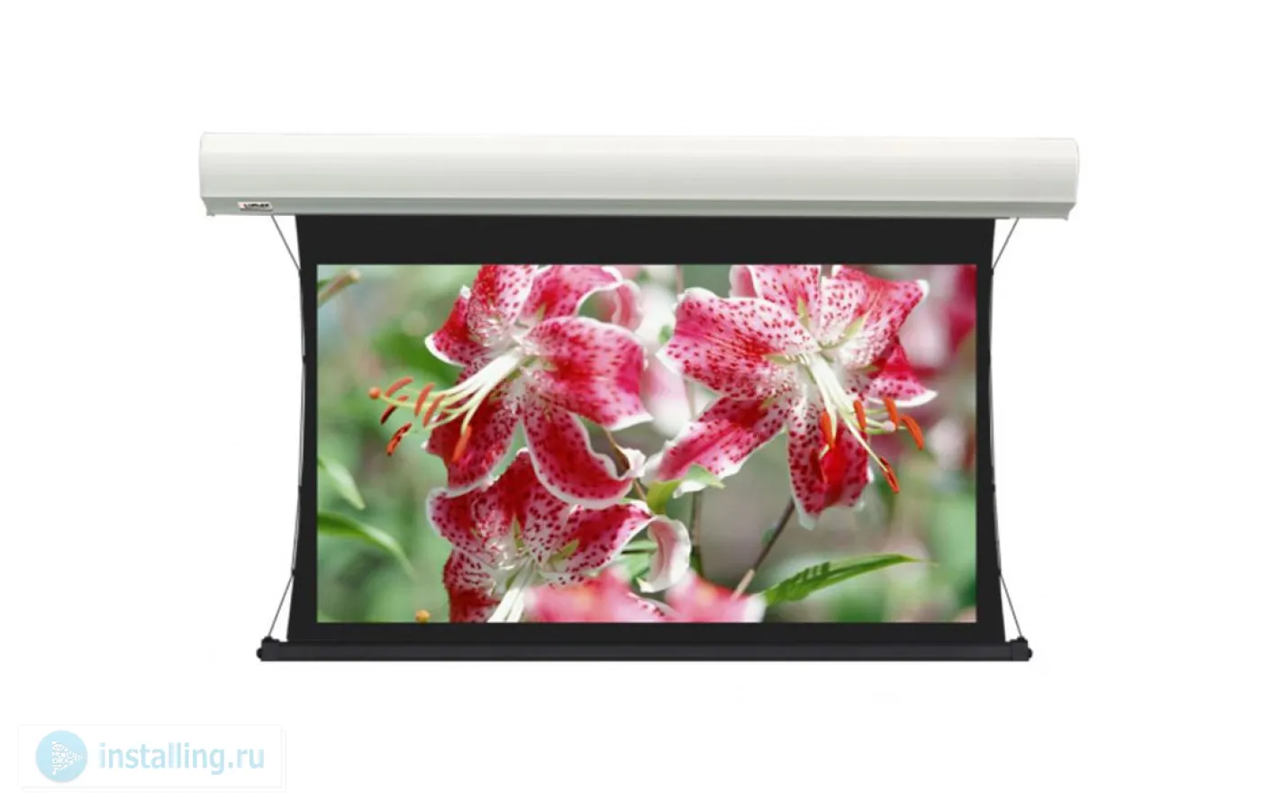 - • идеальная система натяжения обеспечивает абсолютно плоскую поверхность экрана, позволяя проецировать любые изображения при любых условиях инсталляции ;