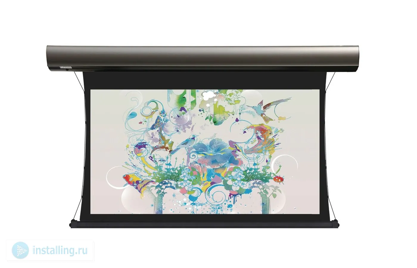 - • идеальная система натяжения обеспечивает абсолютно плоскую поверхность экрана, позволяя проецировать любые изображения при любых условиях инсталляции ;