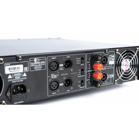 CVGaudio CLUBBER-350 – профессиональный двухканальный низкоомный усилитель мощности для крупных инсталляций и сценического использования. Усилитель имеет два балансных симметричных (Balance In) входа на разъемах XLR. Два балансных линкующих выхода (Link Out) также на разъемах XLR для подключения дополнительного усилителя мощности или других активных звуковых устройств. Чувствительность входа может настраиваться с помощью селектора на три положения 1,4V, 1V и 0,775V. Акустические системы могут быть подключены на выбор к клеммным зажимам или к разъемам SPEAKON. Усилитель может работать в трех режимах: STEREO - два раздельных канала усиления (Ch1 / Ch2) c раздельной регулировкой уровня громкости / PARALLEL - на два канала подается один сигнал с канала Ch1. Регулировка громкости раздельно для каждого канала / BRIDGE - два спикерных выхода суммируются, соответственно увеличивается мощность. Усилитель работает как одноканальный. Регулировка громкости производится с канала Ch1. Выбор режима работы усилителя производится с помощью специального селектора с задней стороны корпуса. В режиме STEREO и PARALLEL Clubber-350 может работать с сопротивлением нагрузи от 4x до 8ми ohm. В режиме BRIDGE допустимая нагрузка – 8ohm. Мощность CVGaudio Clubber-350 в режиме PARALLEL и STEREO - 4ohm - 525W x 2 / 8ohm - 350W x 2, в режиме BRIDGE - 8ohm - 900W.Стильный металлический корпус имеет высоту 2U и может быть установлен в монтажную стойку. Крепежные “уши” в стойку являются неотьемлимым элементом корпуса. На лицевой стороне располагается информационный жидкокристаллический экран, выводящий информацию о температуре нагрева радиатора выходного каскада усилителя и уровень громкости раздельно для каждого канала. Также на лицевой панели находятся непосредственно регуляторы уровня громкости и светодиодная индикация – наличие входящего сигнала - SIG, перегрузка – CLIP, сработка защиты - PROT, индикатор включения питания и активация режимов работы - PARALLEL или BRIDGE. Усилитель имеет постоянное активное охлаждение. Предусмотрены все необходимые системы защиты - защита от короткого замыкания, перегрузки, перегрева, защита по электропитанию с предохранителем. Усилитель имеет софт-старт и задержку подключения спикерного выхода на время переходных процессов при включении. Благодаря до мелочей продуманной схемотехнике и высокому качеству используемых компонентов работа CVGaudio Clubber - 350 (при соблюдении правил эксплуатации) будет безупречной в течении всего срока службы устройства.