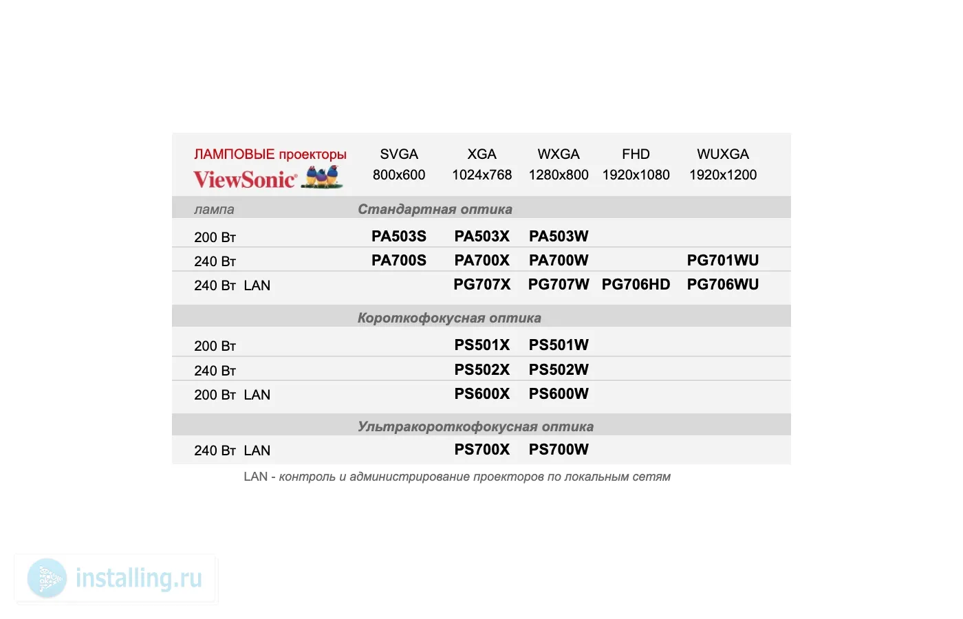 Кроме типа объектива и разрешения, принципиальными отличиями моделей являются наличие функции администрирования по LAN и мощность ламп (200 Вт или 240 Вт).