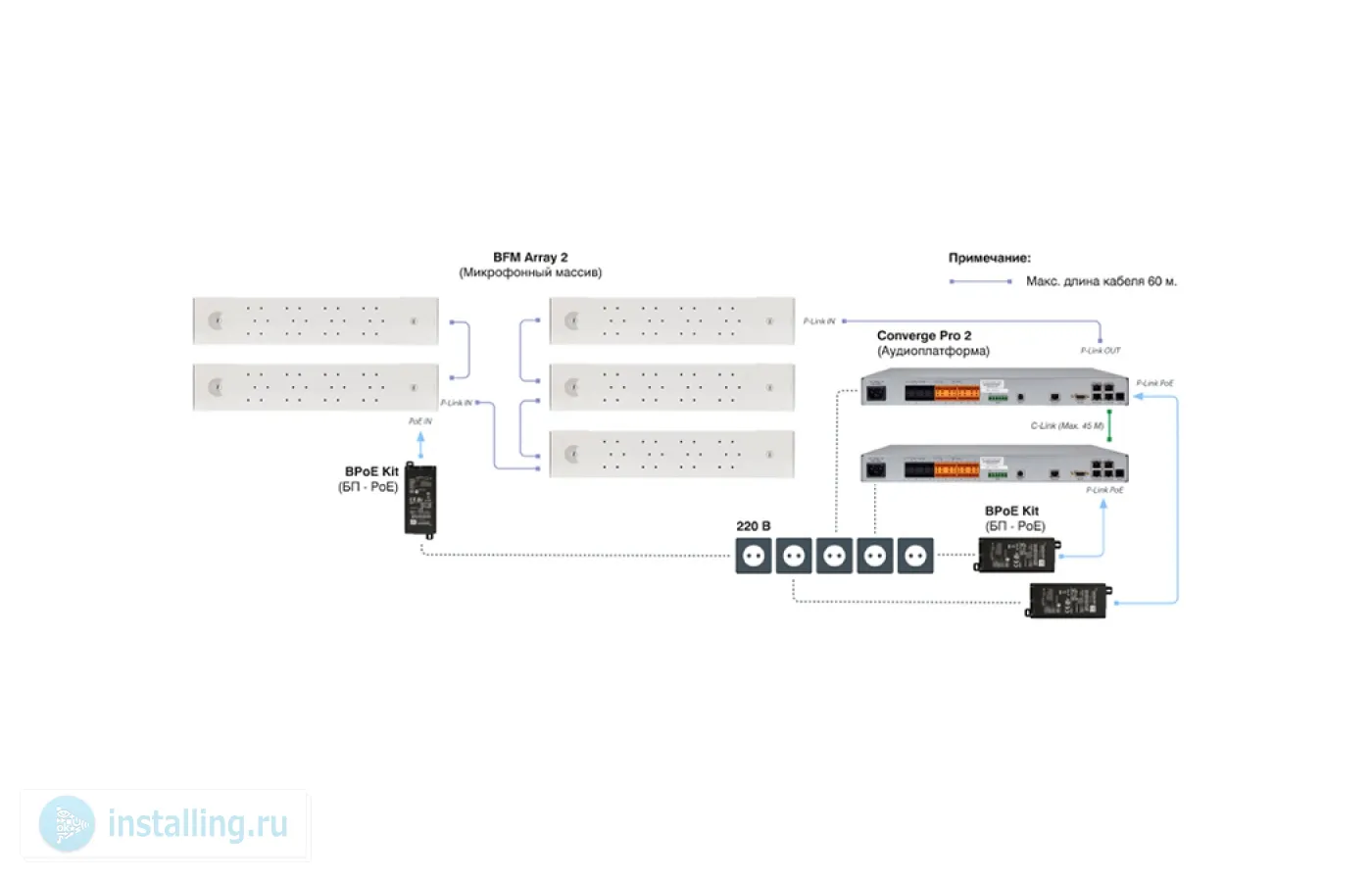 - Аудиоплатформы линейки CONVERGE® Pro 2 поддерживает одновременное подключение до 3-х микрофонных массивов цепочкой