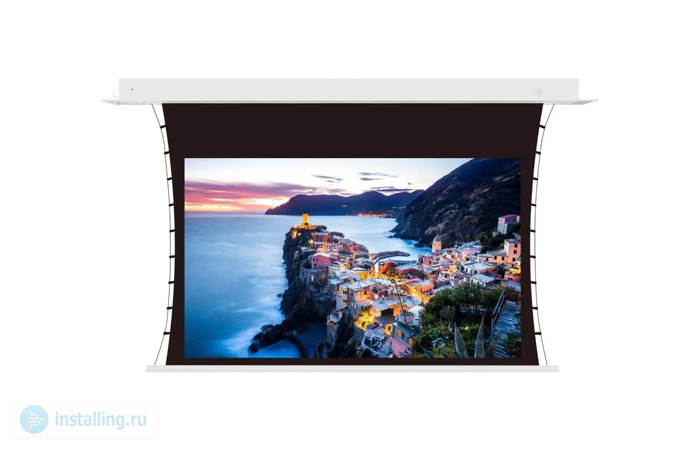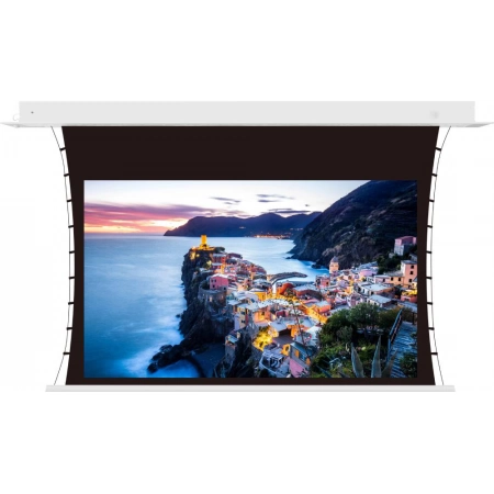 Электроприводный экран, встраиваемые в потолок, для инсталляций, в который экран должен быть максимально незаметен. треугольная алюминиевая планка в нижней части полотна при сворачивании экрана убирается в корпус, полностью скрывая экран в потолке. Боковое натяжение полотна обеспечивают идеально ровную поверхность изображений. Поэтому экран совместим с короткофокусными и ультракороткофокусными проекторами. Идеален для различных областей применения: корпоративные пространства, гостиничные комплексы и банковские структуры, а также домашние кинотеатры.