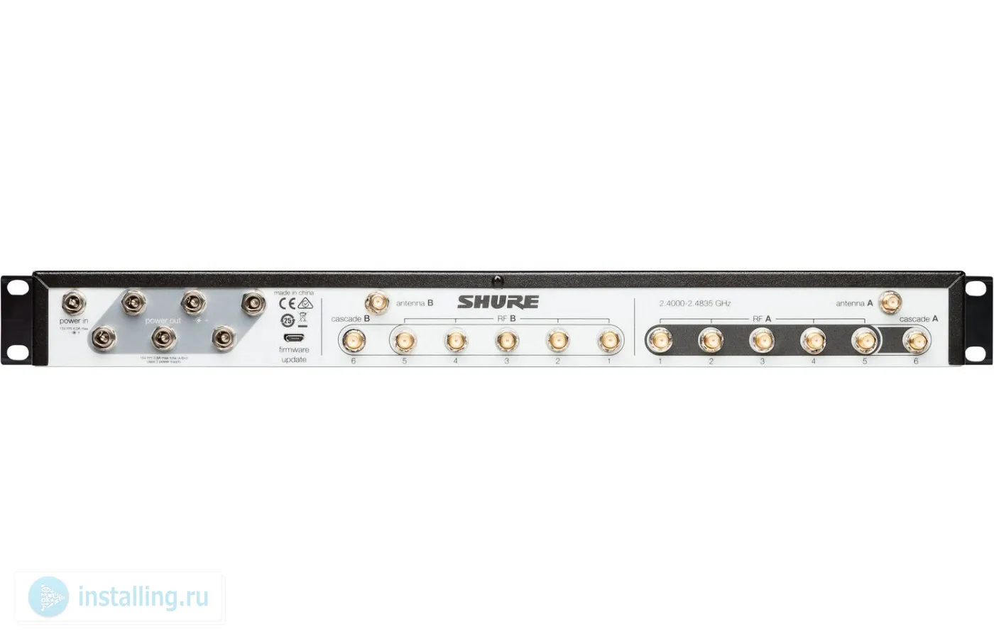 SHURE UA846Z2/LC-E – частотный менеджер для цифровых радиосистем GLX-D® Advanced. Один менеджер позволяет соединить до шести рэковых приёмников GLXD4R. Менеджер может работать с частотами для 9 систем в типичных условиях и для 11 систем при идеальных условиях. Эта модель идеально подойдёт для применения в образовательных и религиозных учреждениях, в концертных залах. SHURE UA846Z2 позволяет автоматически настраивать радиочастоту, на которой работает беспроводная система, для того, чтобы обеспечить стопроцентную стабильность передачи и гарантировать максимально возможную чистоту сигнала. Менеджер сканирует радиочастоты в диапазоне 2,4 ГГц и находит наиболее подходящие, а также запасные доступные для использования частоты с использованием революционной технологии автоматического менеджмента частот LINKFREQ. Несколько приёмников GLXD4R подключаются к менеджеру с помощью антенного разъема RF. Размеры устройства: 483 мм х 192 мм, высота - 45 мм. Вес модели – 1,63 кг. Рабочий диапазон радиочастот – от 2400 МГц до 2483,5 МГц. Сопротивление – 50 Ом.