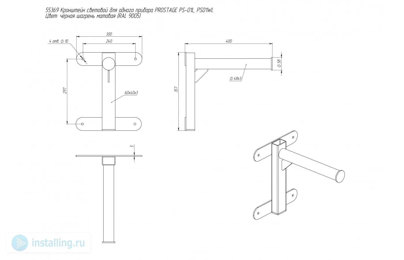 Материал Сталь. Высота, L (мм) 357. Количество консолей 1. Диаметр консоли (мм) 48. Длина консоли (мм) 400. Нагрузка на консоль (кг) до 45. Вес (кг) до 5. Цвет матовая черная шагрень.