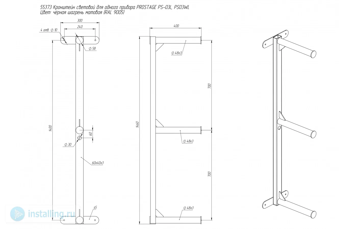 Высота, L (мм) 1400. Количество консолей 3. Диаметр консоли (мм) 48. Длина консоли (мм) 400. Шаг между консолями (мм) 700. Нагрузка на консоль (кг) до 45. Общая нагрузка (кг) не более 120. Вес (кг) не более 13. Цвет матовая черная шагрень.