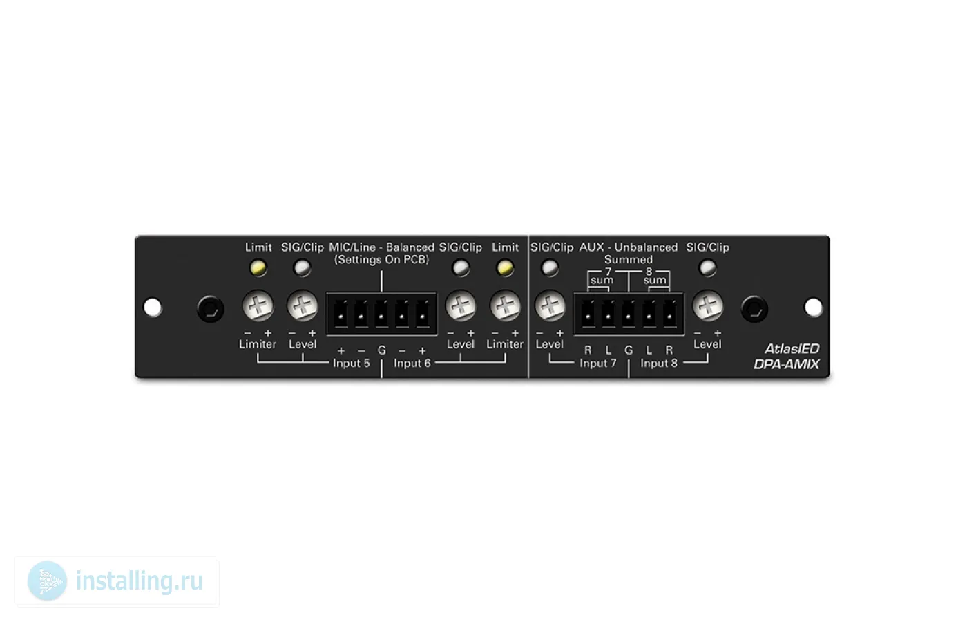 DPA-AMIX – карта расширения на четыре дополнительных аналоговых входа, предназначенная для усилителей DPA2402, DPA1202, DPA602, обеспечивает прием четырех каналов аудио. При использовании этой карты усилители имеют восемь входных каналов. Все входы могут быть смикшированы и направлены в любой канал усиления благодаря встроенному в усилитель DSP-процессору.