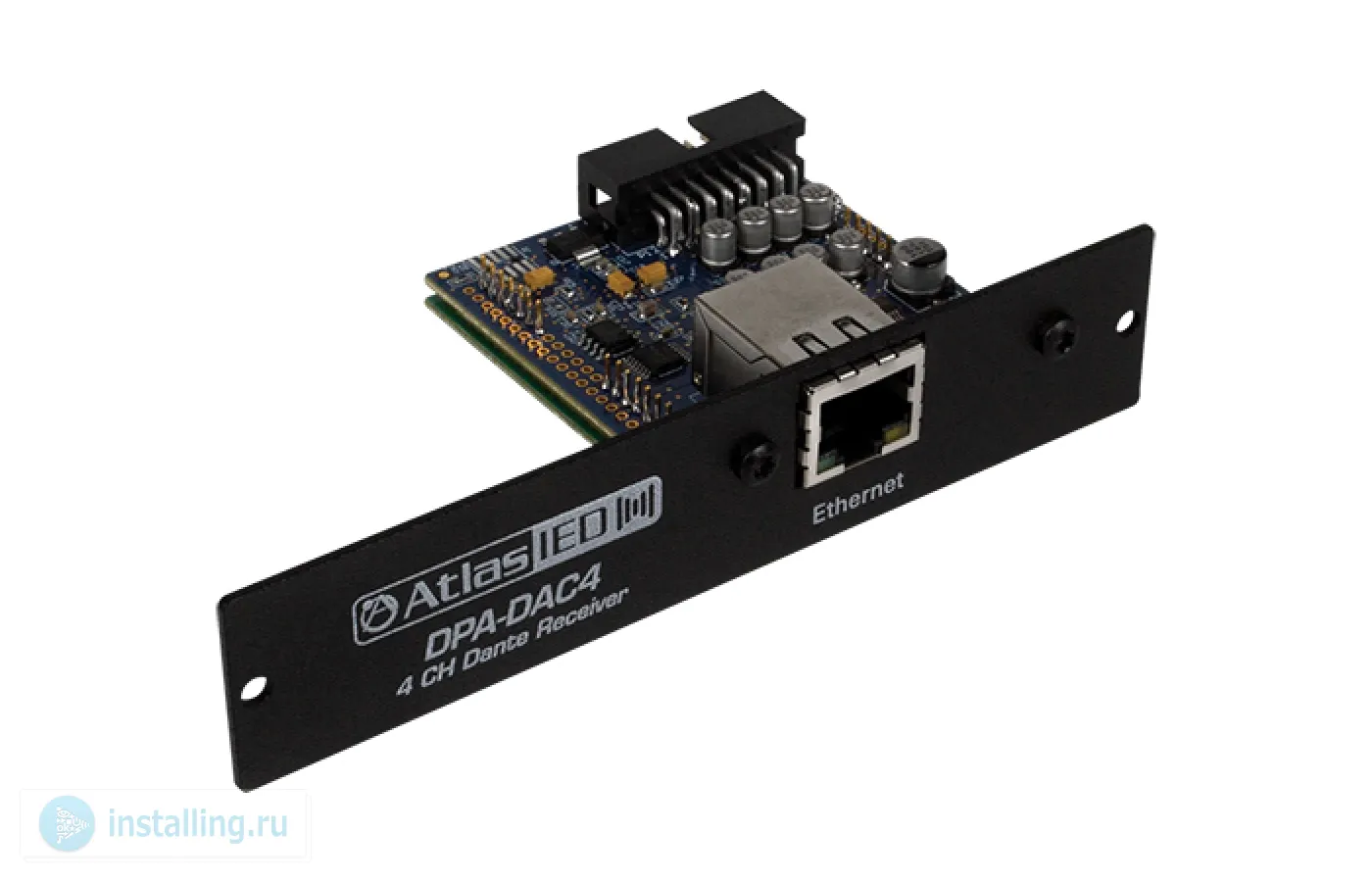DPA-DAC4 – карта расширения Dante на 4 входных канала (разъем RJ45) для четырехканальных усилителей серии DPA. Поддержка 100BaseT. Позволяет расширить число входов усилителя до 8-ми, каждый из цифровых каналов может быть смикширован с любым аналоговым каналом усилителя и направлен на любой из усиленных выходов. Возможна обработка сигнала с помощью встроенного в усилитель DSP-процессора, а также использование с DSP-процессорами BlueBridge.