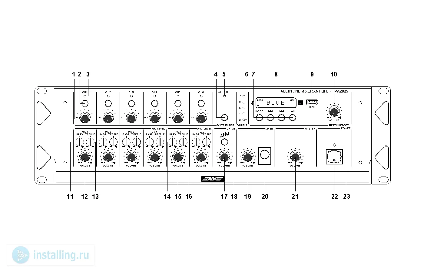 Напряжение: 70/100В, вход: 2 микрофонных, 1 AUX, цифровой AM/FM тюнер, кассетная дека, CD-плеер, 250Вт