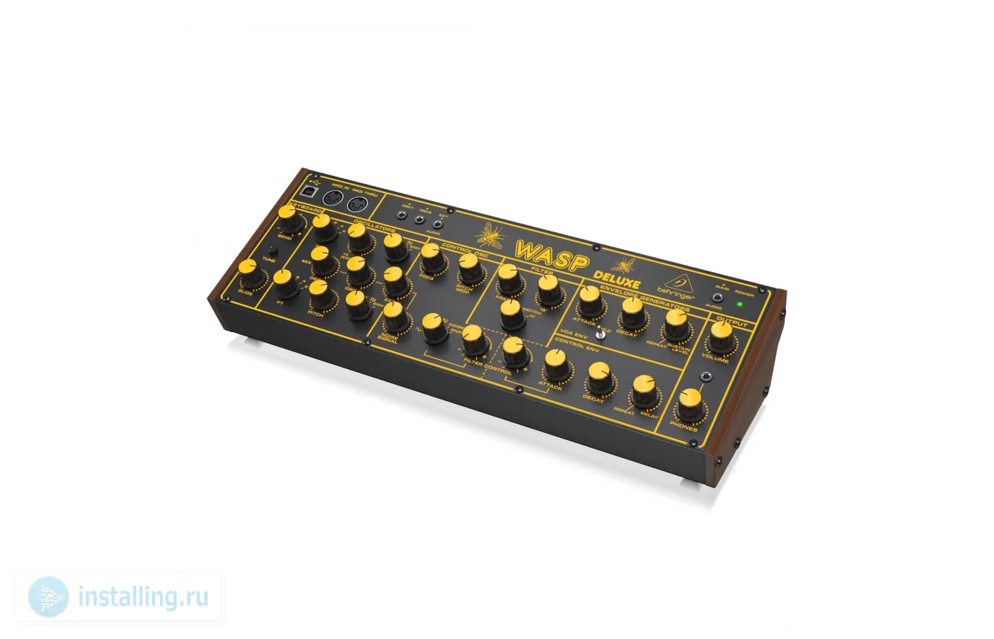 Behringer WASP Deluxe - гибридный монофонический синтезатор, копия классической модели EDP Wasp. Оригинальный инструмент известен благодаря своему резкому и острому звучанию. EDP Wasp был основан на сдвоенном цифровом осцилляторе со сдвоенными огибающими и оснащался аналоговым мультирежимным фильтром и секцией модуляции. Копия в точности повторяет все схемы оригинального инструмента. Модель оснащается точными копиями оригинальных транзисторов и JFET. Реплика получила также порты USB и MIDI и дополнительные гнезда для патчинга, с помощью которых можно объединить до 16 синтезаторов между собой, а также скоммутировать синтезатор с Eurorack. Синтезатор имеет два цифровых осциллятора с тремя формами звуковой волны — Pulse, Ramp, Enhanced. Также доступна модуляция звуковой волны на осцилляторе OSC1 и управляемая высота звука на осцилляторе OSC2. Кроме того, имеются аналоговые управляемые напряжением фильтры: High Pass, Low Pass, Notch, Band Pass, Sweepable Resonance и низкочастотный осциллятор с шестью формами звуковой волны и возможностью модуляции частот и высоты звука. Также на борту имеются 2 аналоговых генератора ADS-огибающей с настройками атаки, спада и сустейна. 29 элементов управления дают доступ ко всем важным параметрам. Имеется дополнительный аудиовход для подключения и обработки внешних устройств.
