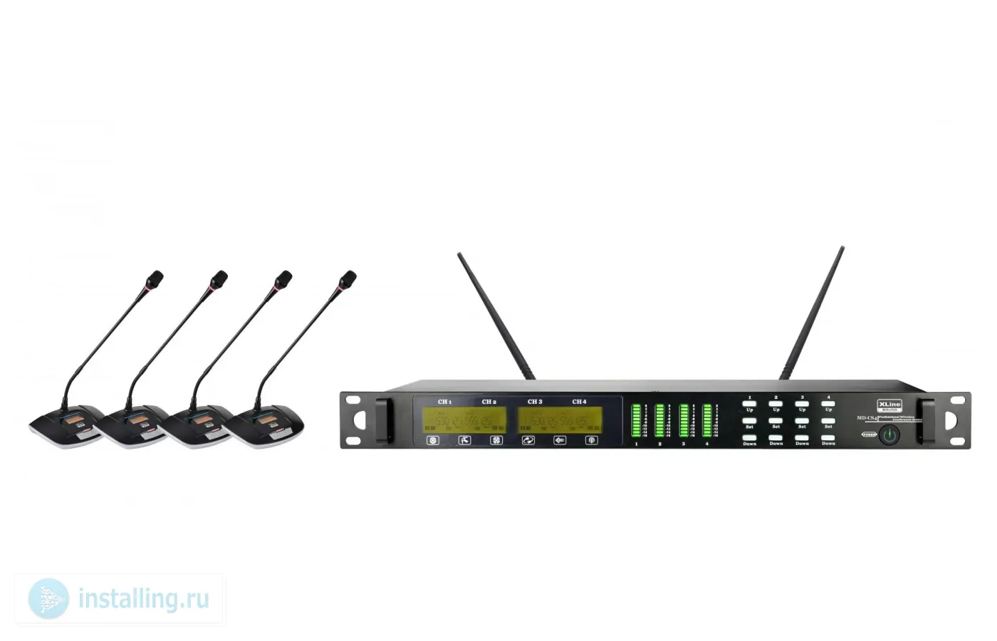 Радиосистема UHF состоящая из 4 настольных радиомикрофонов типа "гусиная шея" и 4-канального приемника. Для проведения совещаний, круглых столов. Возможно одновременное использование четрых систем MD-CS4 на 16 рабочих мест.