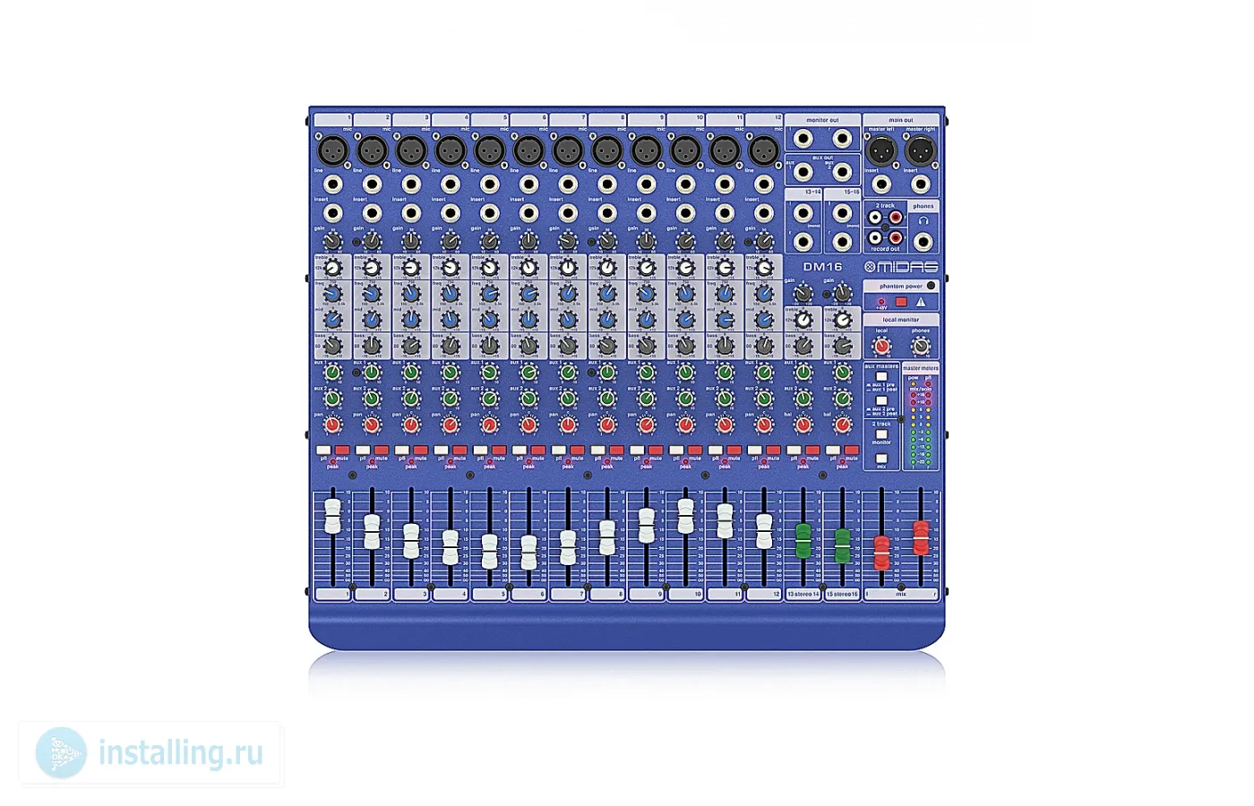 Микшерный пульт MIDAS DDA DM16, благодаря наличию высококлассных микрофонных предусилителей, отлично подходит для студийного использования и концертной работы. Микшер имеет дополнительные мониторные выходы, AUX-посылы, 2 стереовхода, 3-полосные эквалайзеры с полупараметрической серединой на всех моно каналах, выход на наушники. Предусмотрены опции PFL и Mute на каждом канале.
