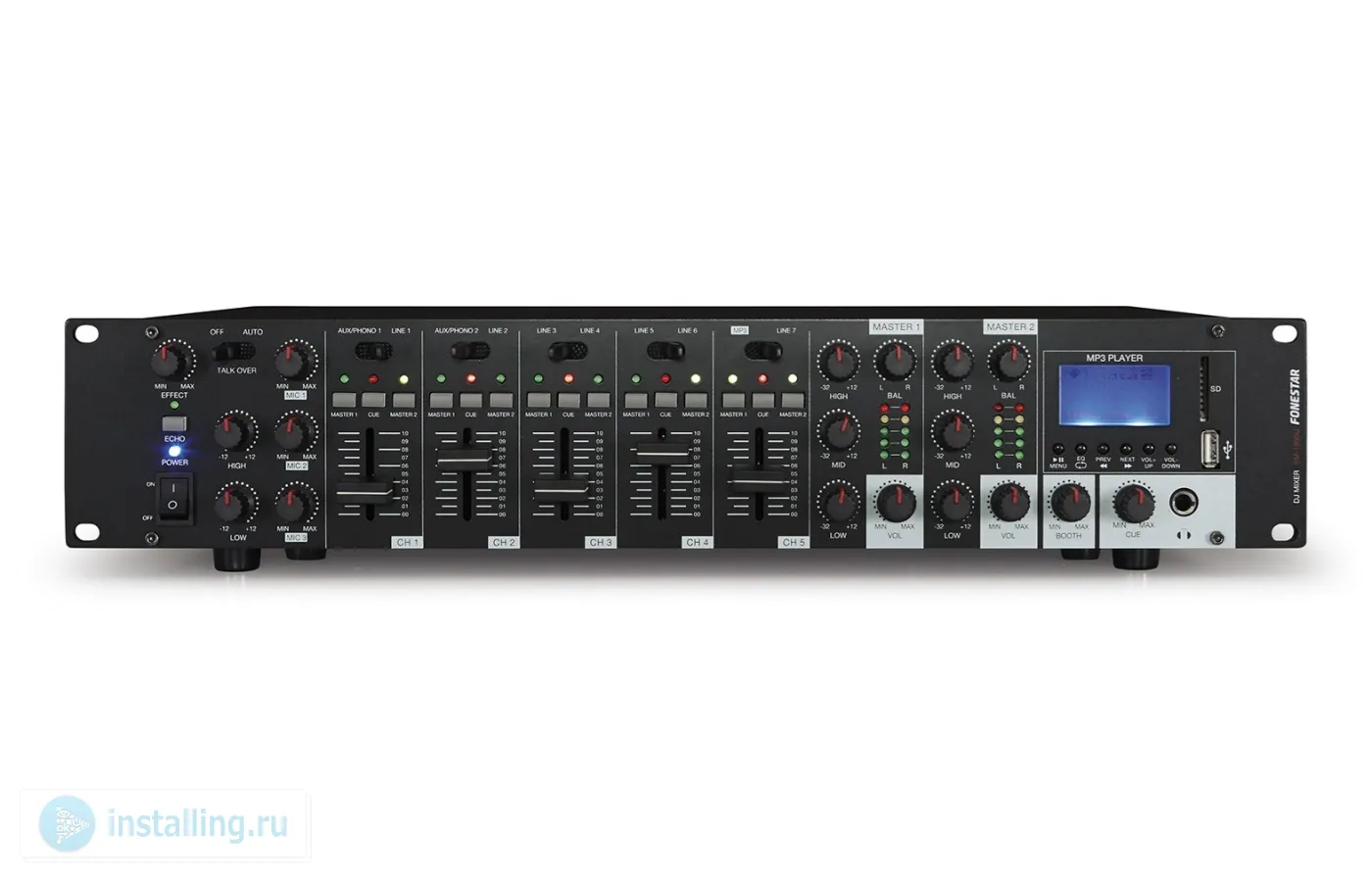 SM-1860U – 8-канальный микшер с 12 входами линейных и микрофонных сигналов, балансными и небалансными стереовыходами. Обеспечивает трехполосную эквализацию. Имеет проигрыватель файлов с USB-устройств и SD-карт. Микрофонные входы не имеют фантомного питания. Установка на стол и в стойку, высота устройства 2U.