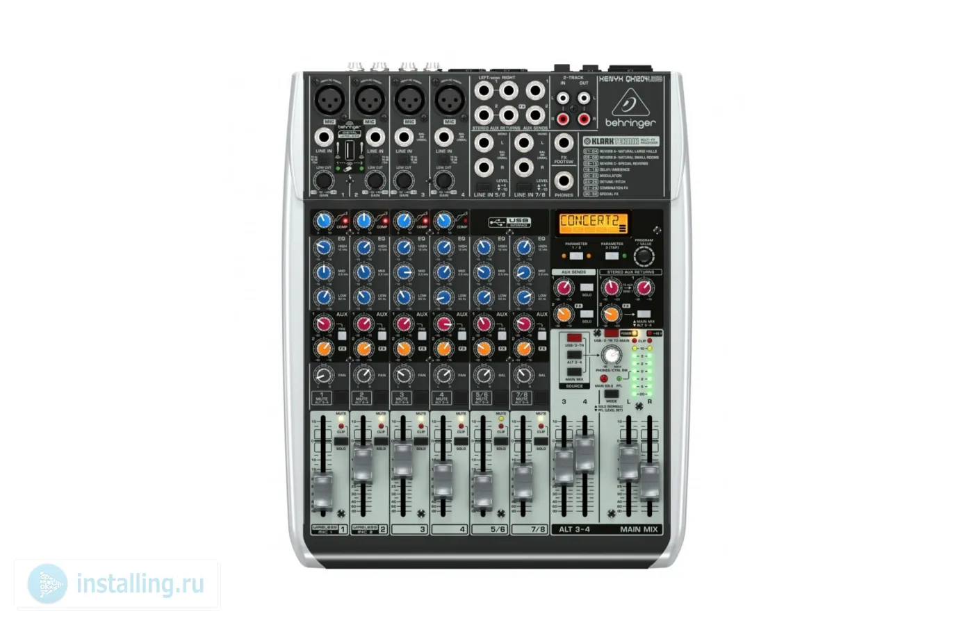 XENYX QX1204USB подходит как для организации концертов и выступлений, так и для студийной работы. Для обработки звука «в полевых условиях» пригодится использование микшера совместно со специальным передатчиком для беспроводных микрофонов, а также применение отдельных для правого и левого канала фейдеров громкости основного микса и ALT-шины, позволяющих учесть особенности акустики помещения. Для сведения звука под запись или трансляцию будут полезны встроенный эффект-процессор KLARK TEKNIK с LCD-дисплеем для удобной настройки программ обработки и USB-интерфейс для подключения микшера к компьютеру.