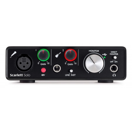 Компактный и портативный интерфейс вы можете использовать в любом месте и для этого вам не нужен источник питания в 220 В благодаря тому, что Scarlett Solo питается от USB. Интерфейс поставляется со всем необходимым программным обеспечением, состоящим из Pro Tools | First Focusrite Creative Pack и Ableton Live Lite и пакетами плагинов Focusrite`s Red Plug-In Suite, и Softube Time and Tone Bundle, включающие в себя TSAR-1R Reverb, Tube Delay, Saturation Knob и Drawmer S73, а также возможность загрузки 1Гб семплов из библиотек Loopmasters.