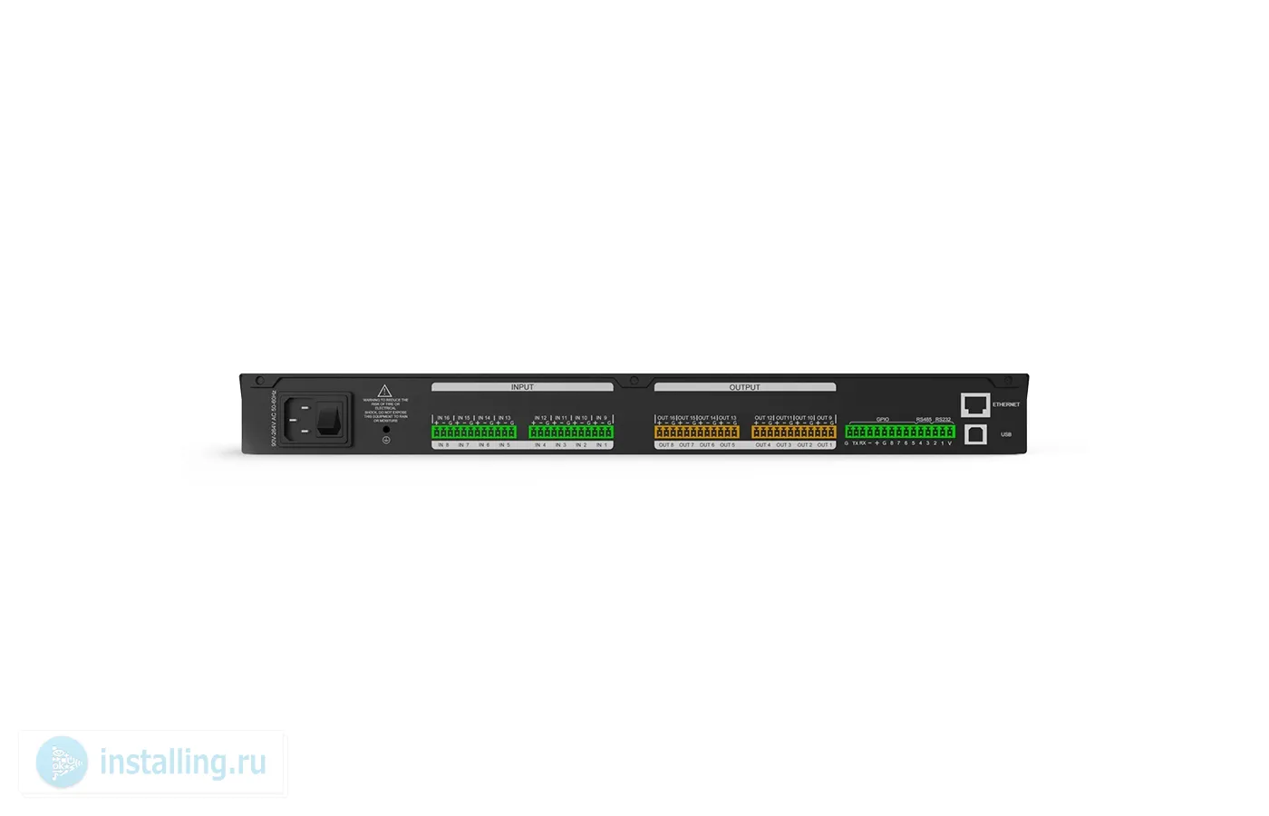Входы 8 каналов mic/line. Выходы 8 каналов. Функции каналов: Acoustic Noise Control, Acoustic Echo Control, Echo Revert effects, FIR phase correction. Поддержка авто микширования и матричного микширования всех каналов. Подключение USB,TCP /IP. Поддержкауправления RS232, RS485 и внешнего управления GPIO. Поддержка отслеживания камеры. DSP 32-бит DSP 300MГц. Питание: +48VDC. Частотный диапазон: 20гЦ-20кГц (+-0.5дБ)/Line 20гЦ-20кГц(+-1.5дБ)/Mic. Гармонические искажения THD+N: -90дБ (@12dBu,1кГц,A-wt)/Line -86дБ(@-7dBu,1кГц,A-wt)/Mic. Сигнал шум: 105дБ(@12dBu, 1кГц, A-wt)/Line 95дБ (@-7dBu, 1кГц, A-wt)/Mic. Управление с помощью энкодера и ПО на ПК Windows. Габариты: 44x483x210 мм. Вес: 3.3 кг.
