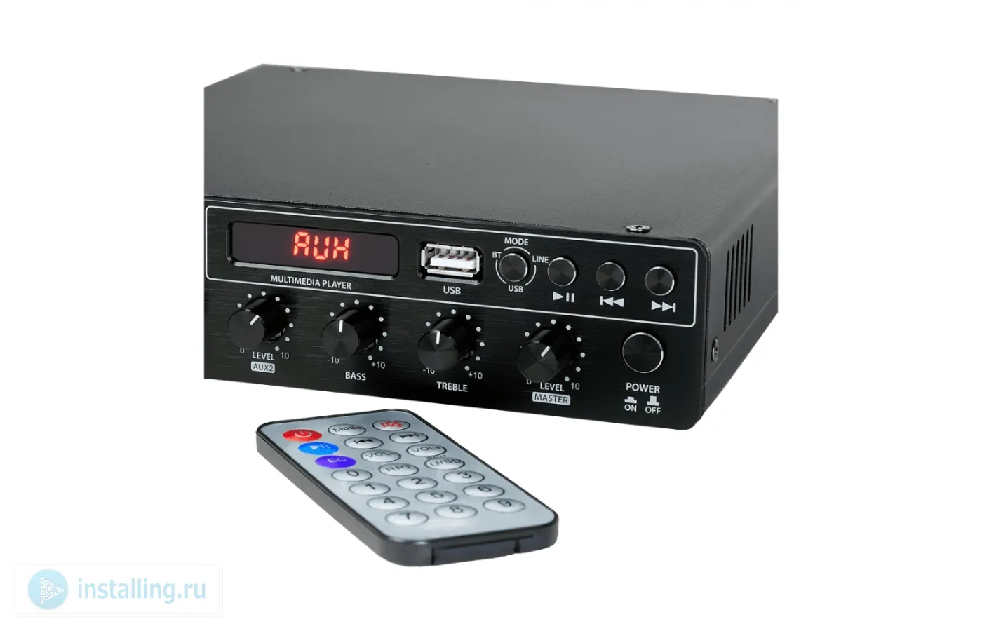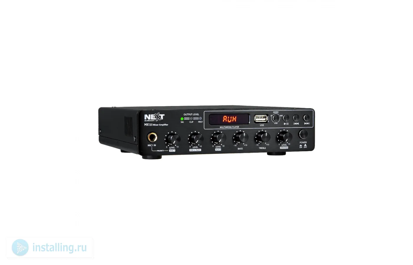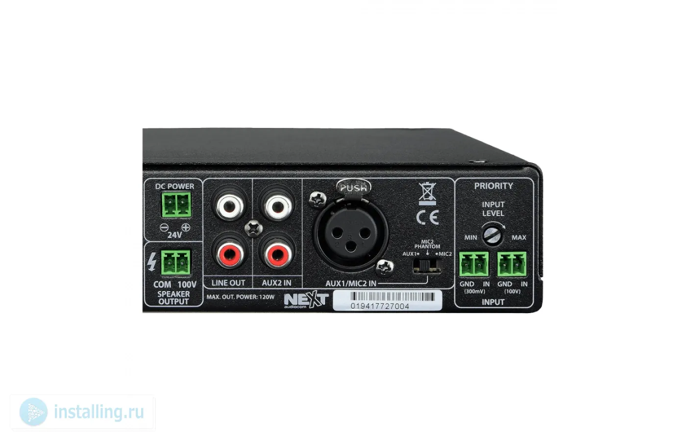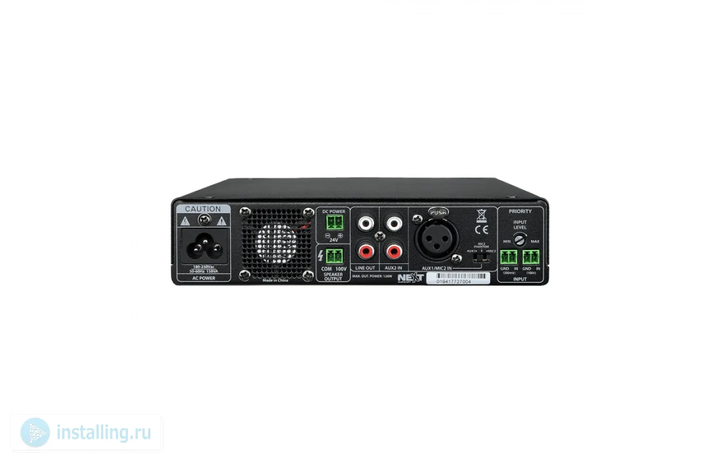 Class D, 1 х 100V/120 Вт. Частотный диапозон 80Hz - 16kHz. SNR (соотношените сигнала к шуму) Mic: >74dB | Line-in: >80dB. Входная чувствительность Mic: 60mV (±15mV) | Line-in : 300mV(±20mV). Гармоничесие искажения THD+N <0.5%. 3х - канальный микшер. Входы: 1 x Stereo RCA | 1 x MIC (TS) | 1 x MIC or AUX (XLR) | 1 x Line-in (Phoenix Connector) | 1 x 100V IN (Phoenix Connector) | 1 x USB A Type Bluetooth v5.0 (радиус 10 м). Выходы 1 x Stereo RCA. Специальные функции: Ducking | Priority Mic. | Фантомное питание (+48V) | НЧ тембр: ±10dB (100Hz) | ВЧ тембр: ±10dB (10kHz) Встроенный аудио плеер. Материал корпуса алюминий, сталь. Потребляемая мощность 150Вт. AC 180V - 250V / 50Hz - 60Hz and/or DC 24V - 6A. Размеры 200 x 44 x 190 мм. Вес: 2 кг.