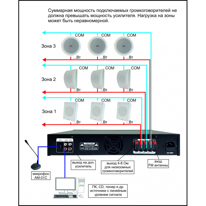 Трансляционный микшер-усилитель120Вт, 100В, USB, FM тюнер, Bluetooth, 3 зоны трансляции; Независимая регулировка громкости в каждой зоне. Входы:2 микрофонных (1-й приоритетный), 1 линейный.220В 50 Гц .Возможность работы на нагрузку сопротивлением4-16 Ом.400x66x270 мм, 6,3 кг.