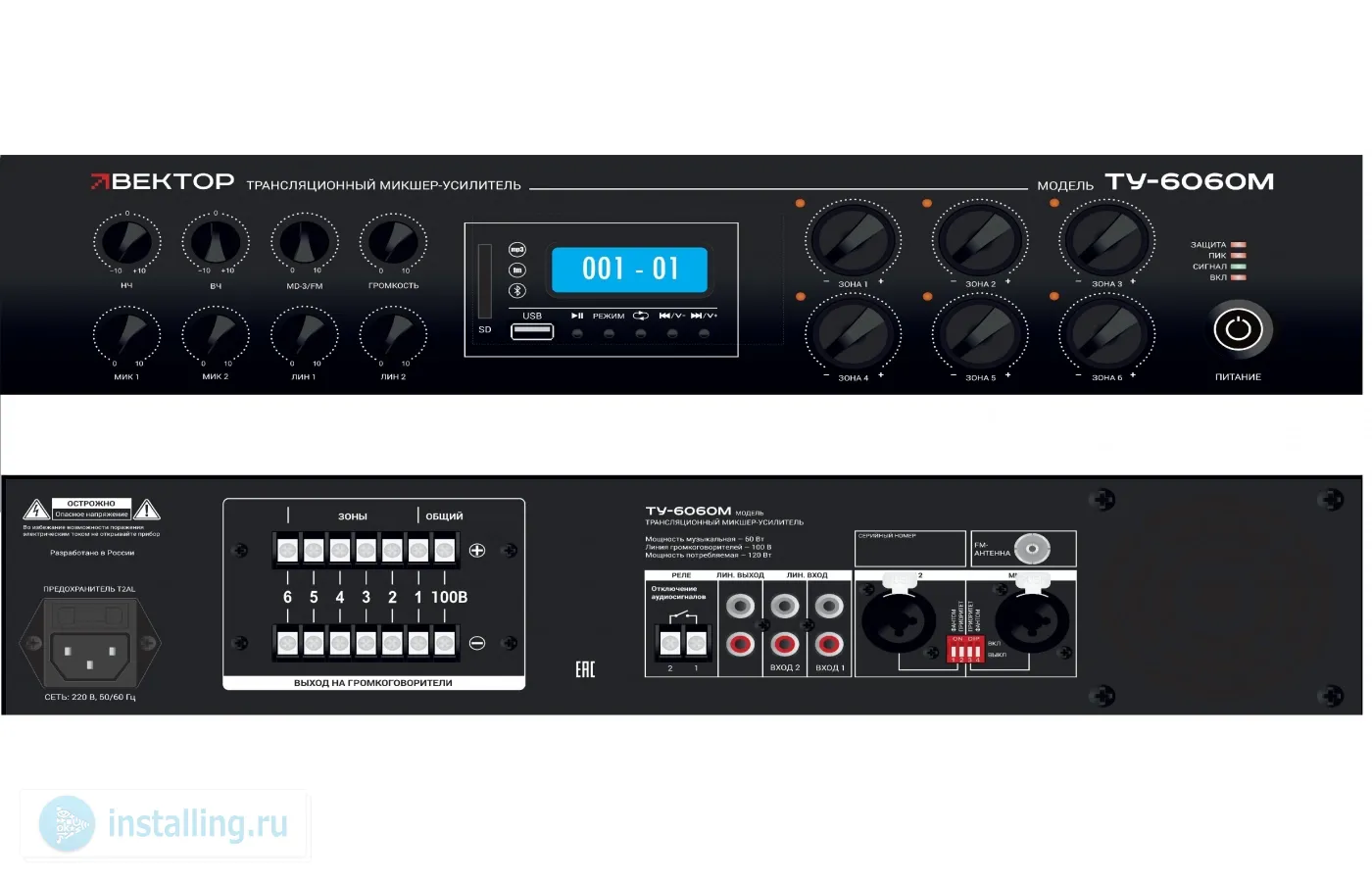6 зон, AMFM тюнер, MP3 плеер, 480 вт/100В, регулировкауровня каждого выходного сигнала.2 микр, с фантомным питанием и выбором приоритета 2 лин входа, 1Aux вых. ,ИК-пульт в комплекте. Функция аварийного отключения, 220 В, рэковое крепление в комплекте, 482 х 88 х 400 мм. Вес 19,8 кг.