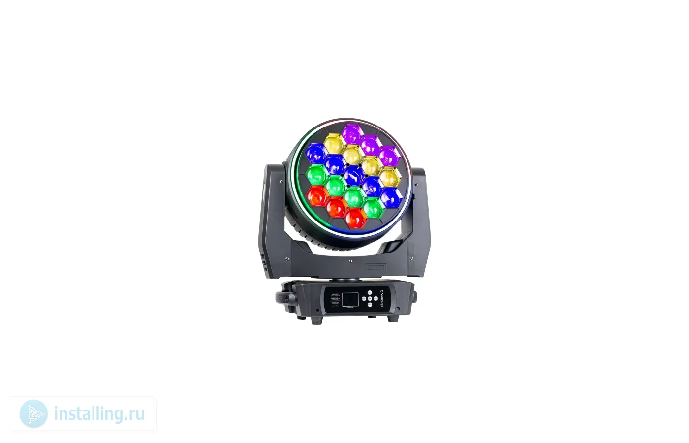 Световой прибор. Вращающаяся голова типа: Wash. Источник света: 19х40 Вт RGBW OSRAM LED. Световое кольцо: 5050RGB 74х0,12 Вт.Срок жизни источника света: 50000 часов. Угол раскрытия луча: 6°~50°. Эффект калейдоскопа.Строб: 0-20 вспышек в секунду. Управление: 24/26/38/81/95/100/102 канала DMX 512, Master-slave, Sound, Auto. Вращение PAN/Tilt: 540°/270°. Энергопотребление: 760 Вт. Размеры прибора: 440х405х306 мм. Размеры упаковки: 580х550х380 мм. Вес нетто/брутто: 18/20 кг.