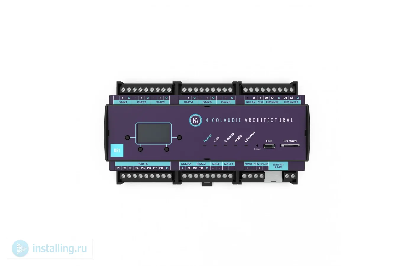 DINA-DR 1-это контроллер для управления освещением с возможностью подключения до 6 DMX-юниверсов (3072 канала) в 20 зонах. Запускайте сцены освещения с помощью триггеров календаря и условных правил с помощью нового автономного движка, используя контактные порты, RS232 или через Ethernet.