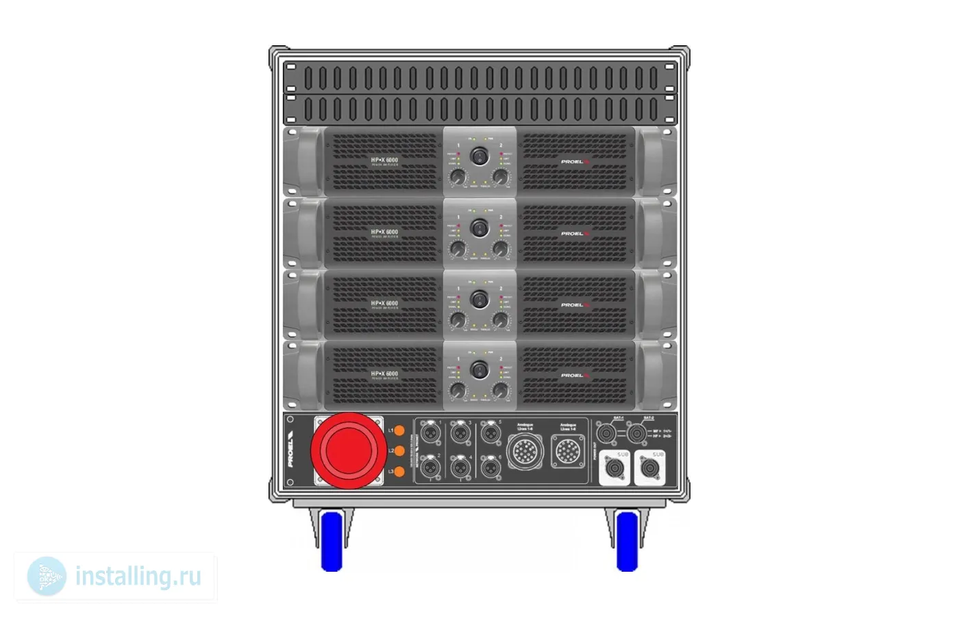 С четырьмя усилителями HPX6000, процессором и панелью SDISTRO03