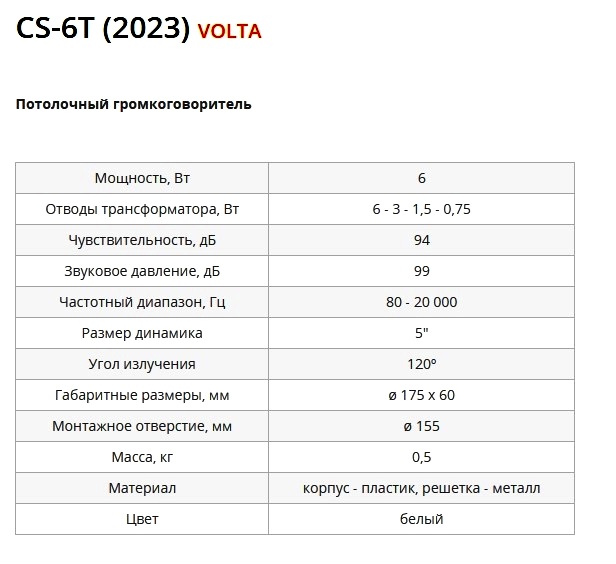 6/3/1,5/0,75 Вт; 100В; 99дБ; 80-20 000 Гц; Материал корпуса - пластик, решетка - металл, D175х60 мм; 0,5 кг