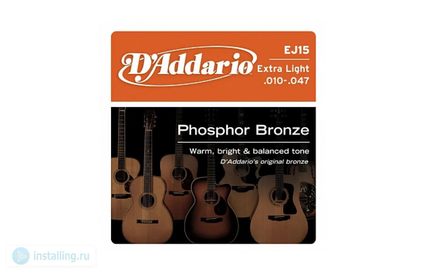 Струны D'Addario EJ15, имеющие самый малый калибр среди струн для акустических инструментов, идеально подходят для начинающих исполнителей и для тех, кто предпочитает теплое звучание и легкость оттягивания струны.