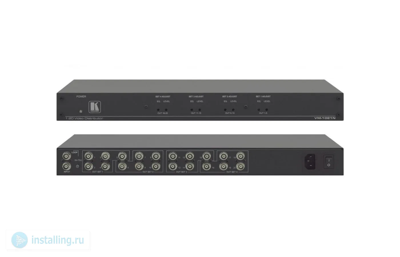 VM-1021N – усилитель-распределитель 1:20 сигналов CV/SD-SDI, разъемы BNC. Распределяет входной сигнал на 20 идентичных выходов. Для работы в системах с кабельными линиями разной длины на передней панели расположены регуляторы усиления видеосигнала и настройки АЧХ для каждой группы из 5-ти выходов (4 группы). С помощью проходных входов прибор можно интегрировать в разветвленные системы распределения сигналов. Устройство обладает высокой производительностью – полоса пропускания 350 МГц позволяет усилителю-распределителю работать с сигналами высокого разрешения или цифровыми сигналами SD-SDI. Прибор выполнен в надежном и прочном корпусе, подходящем для установки в стандартную 19-дюймовую стойку (занимает высоту 1U).