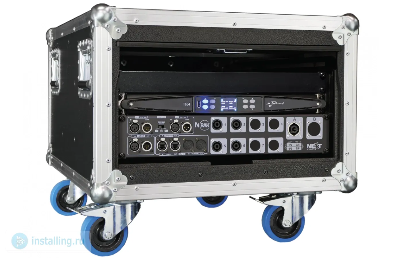 Состав: транспортировочный кейс на колесах, 4х канальнальная силовая распределительная панель сDANTE, сигнальная панель +2 IN, услилитель мощности Powersoft T604 (DSP+Dante) 1шт.. Характеристики: каналы звукоусиления 4 шт., 4 x 1250Вт (2?)/4 x 1500Вт (4?)/ 4 x 1500Вт (8?)/ 2 x 3000Вт мостовой режим (4?)/ 2 x 3000Вт мостовой режим (8?). DSP: Raised-cosine, custom FIR, parametric IIR: peaking, hi/lo-shelving, all-pass, band-pass, band-stop, hi/lo-pass. Габариты ШхВхГ (мм):600 x 530 x 800 мм.