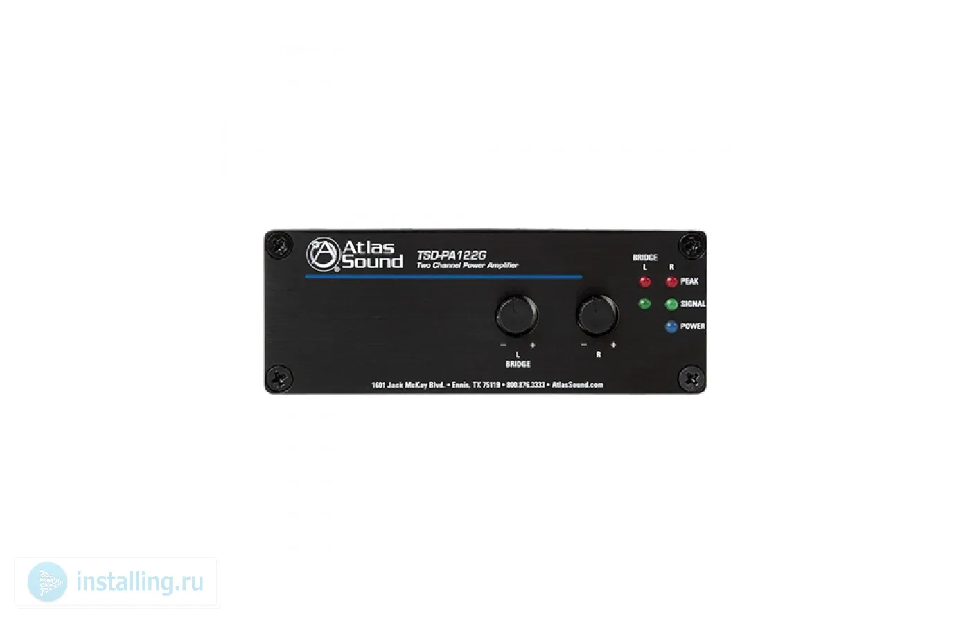 TSD-PA122G - двухканальный усилитель мощности, 1 балансный и 1 небалансный стерео входы (разъемы Phoenix и RCA), 1 стерео выход, переключаемый в моно режим (разъемы Phoenix), выходная мощность 12 Вт на канал на нагрузке 4 Ом (стерео) и 24 Вт на нагрузке 8 Ом (моно), раздельная регулировка усиления в каналах, внешнее питание 24 В постоянного тока. На передней панели усилителя расположены светодиодные индикатор питания и индикаторы нормального и пикового уровней входов левого и правого каналов и 2 ручки раздельной регулировки усиления в каналах. При переключении в режим моно регулировка усиления осуществляется одной левой ручкой. Для предотвращения случайных или несанкционированных изменений ручки могут быть заменены на опционные защитные крышки после установки нужных уровней. Подключения входов и выходов осуществляются на задней панели. Для входов используется два разъема Phoenix или два разъема RCA, для выходов – два разъема Phoenix. Здесь же расположен переключатель режимов стерео/моно. Питание предусилителя осуществляется от внешнего источника постоянного тока напряжением 24 В, подключаемого к разъему на задней стенке. Источник питания поставляется отдельно. Усилитель мощности TSD-PA122G относится к линейке приборов Atlas Sound TSD - "сберегающие время" (англ. time saving devices = TSD), в неё входят микшеры, усилители мощности, предусилители, усилители-распределители и другие управляющие приборы.