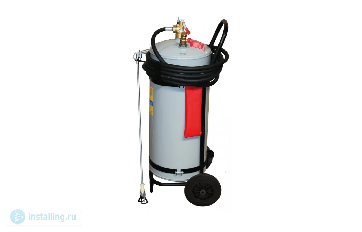 Установка представляет собой металлическую емкость 60л (с внутренним полимерным покрытием) на тележке, соединенную с распылителем, имеющим 9-ти метровый гидрорукав.