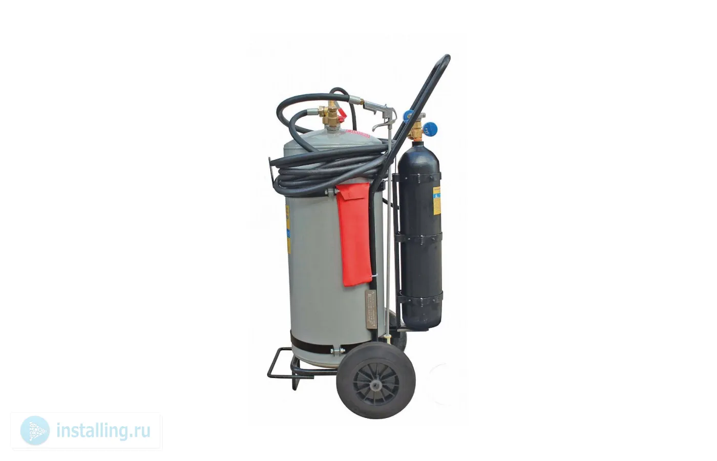 Установка представляет собой металлическую емкость 60л (с внутренним полимерным покрытием) на тележке, соединенную с распылителем, имеющим 9-ти метровый гидрорукав, пусковой баллон с редуктором.