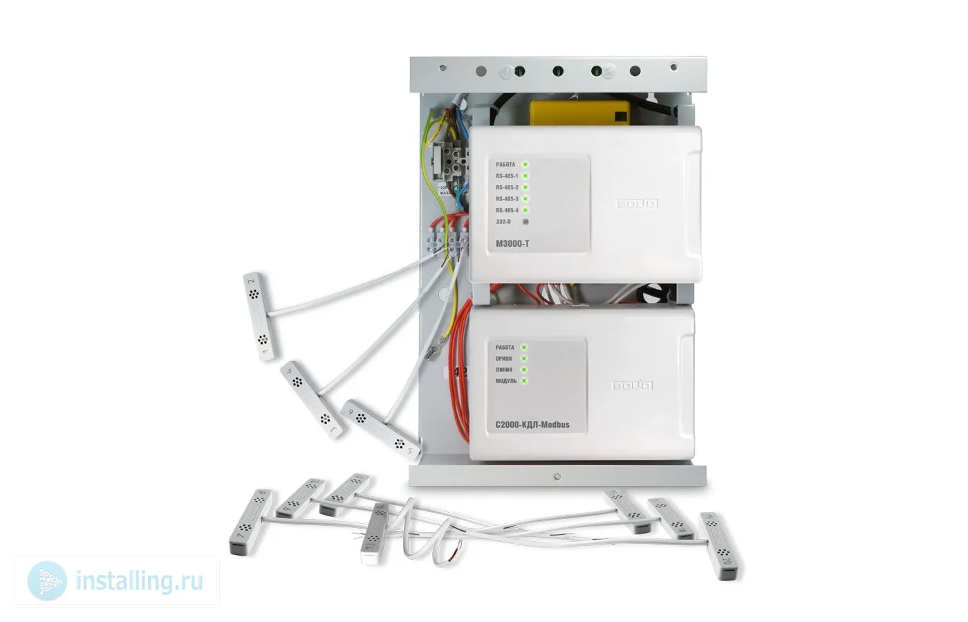 - запитывать датчики и считывать информацию с датчиков по двухпроводной линии связи контроллера "С2000-КДЛ Modbus";