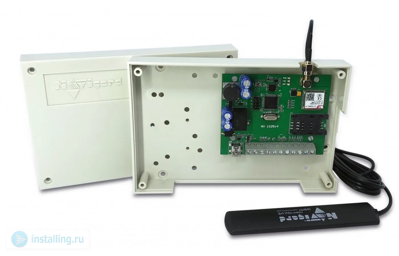 NV 1025 GSM(новый корпус NV 2005) контроллер для удалённого и дистанционного управления шлагбаумом, гаражными воротами, электромеханическими и электромагнитными замками при помощи мобильного телефона; реле 1; 4 ШС; 1000 пользователей; журнал событий 2000 шт; добавление/удаление пользователей по SMS; 12...24В AC/DC; 100 мА; коммутируемый ток релейного модуля 6 А; коммутируемое напряжение не более 250В; -25... +55°C; габаритные размеры без антенны 165х106х40 мм; 0,15 кг