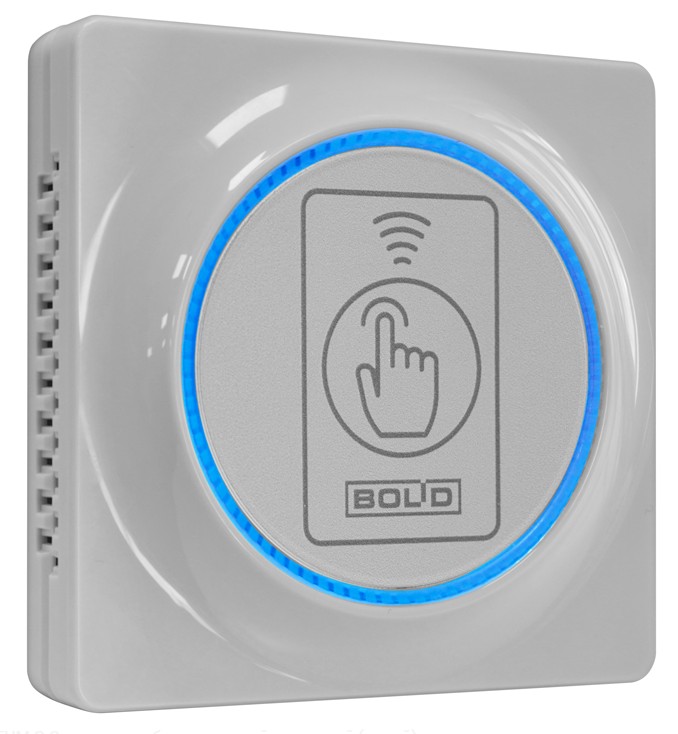 Накладной для работы с идентификационными картами и брелоками стандарта EM-Marin, а также картами HID ProxCard II; выходной интерфейс Touch Memory, Wiegand-26, Wiegand-44; f-раб.125 кГц, максимальное расстояние считывания 100 мм; U-пит.7…14 В, I-потр.130 мА; выход "ОК", выход управления звуковым сигнализатором, выходы управления красным и зелёным светодиодами, встроенная кнопка управления выходом "ОК"; встроенная звуковая и световая сигнализации; IP40, t-раб.-25…+60°C, 85.3х85.3х24.2 мм. Цвет серый.