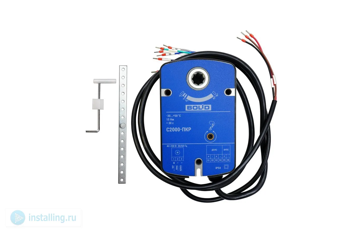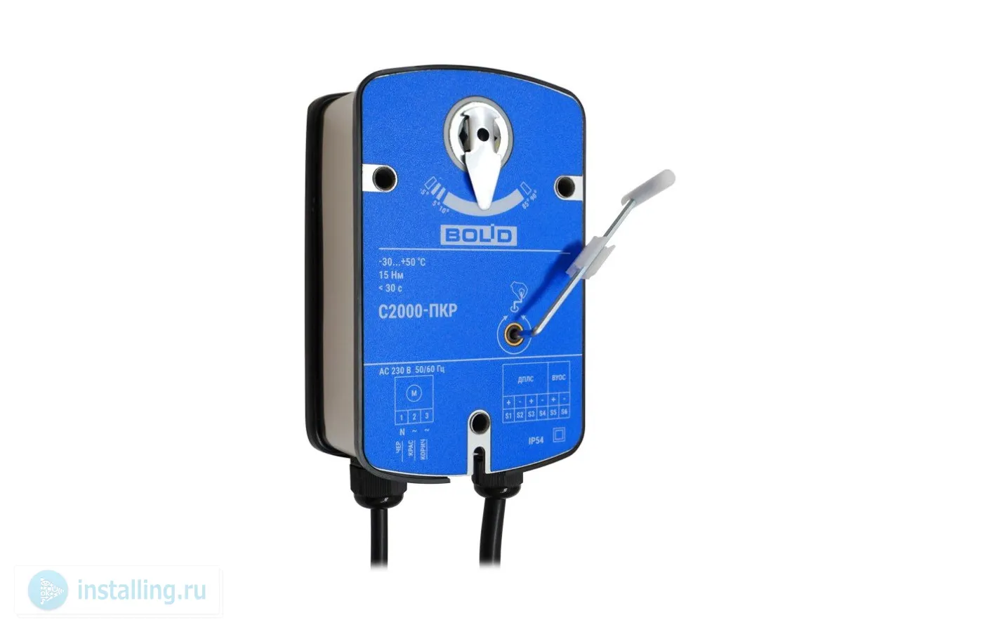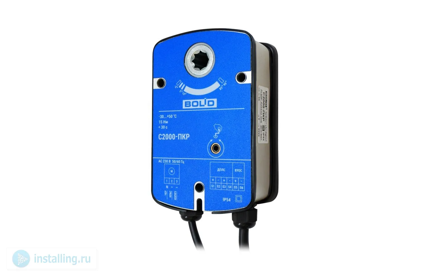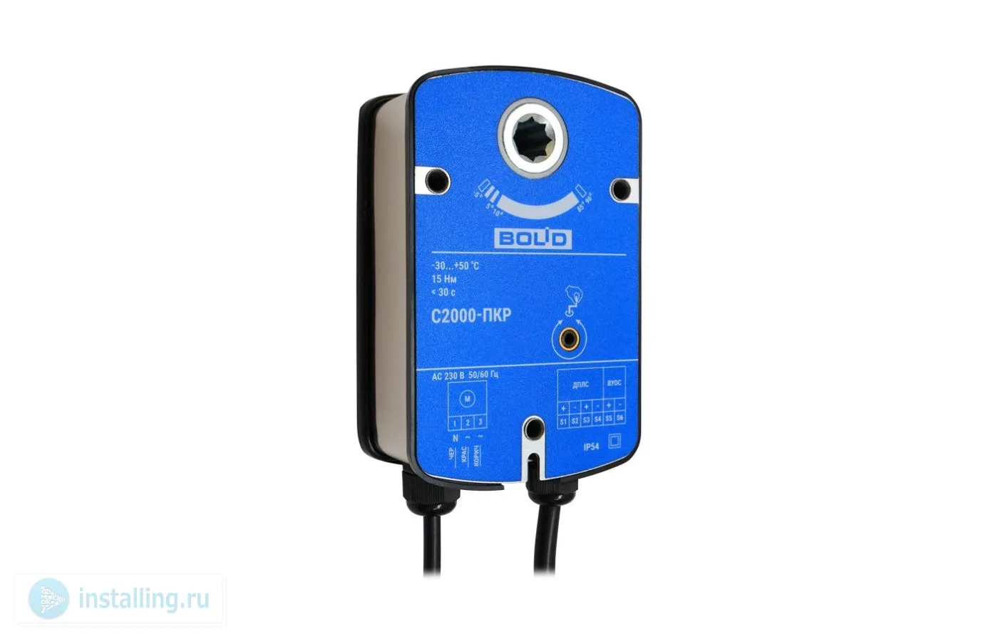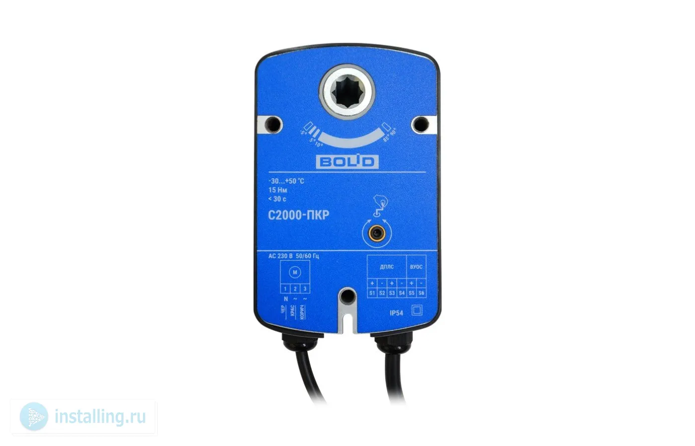 Для работы с прибором С2000-КДЛ со встроенным изолятором короткого замыкания; номинальный крутящий момент выходного вала 15 Н/м, угол поворота выходного вала 90°, время поворота 60 с, передающее звено на вал 12х12 мм; 2 входа питания, U-исп.230 В, P-потр.12 ВА (max); U-пит.8...12 В (по линии ДПЛС), I-потр.3.3 мА; IP54, t-раб.-30...+55°С, 170?102?62 мм