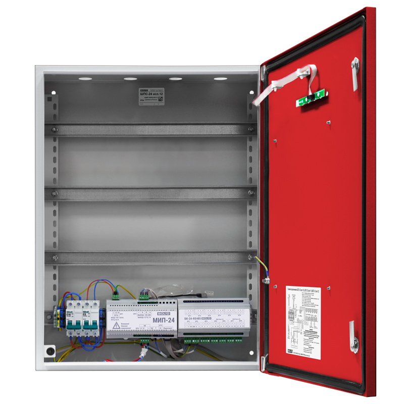 Шкаф для монтажа средств пожарной автоматики с креплением на DIN-рейку; 2 ввода питания; U-вх.180…265 В, U-вых.27.2±6 В, I-ном.3 А, I-макс.3.5 А, под два АКБ 12 В 26/40 А·ч; встроенный блок коммутации БК-24-RS485 (две изолированные линии интерфейса RS-485 для подключения к компонентам ППКП и ППКУП расположенным за пределами ШПС, одна линия RS-485 для подключения компонентов ППКП внутри ШПС; 7 выходов для подключения к приборам внутреннего интерфейса RS-485 и 7 выходов питания; IP41, t-раб.-10…+40°C, 700х600х225 мм. Дверь красного цвета. Возможность установки монтажного комплекта МК-1.